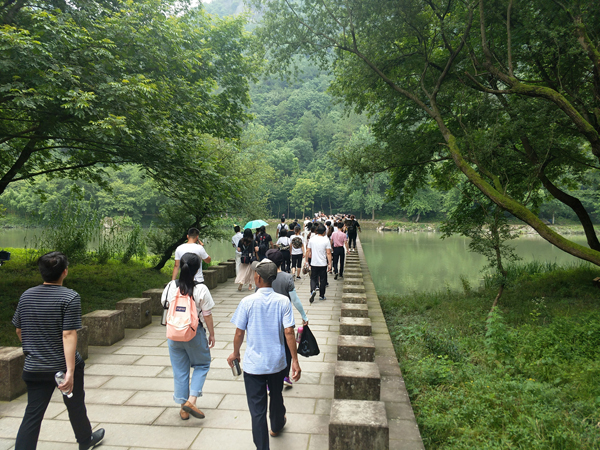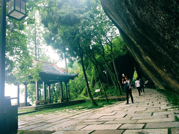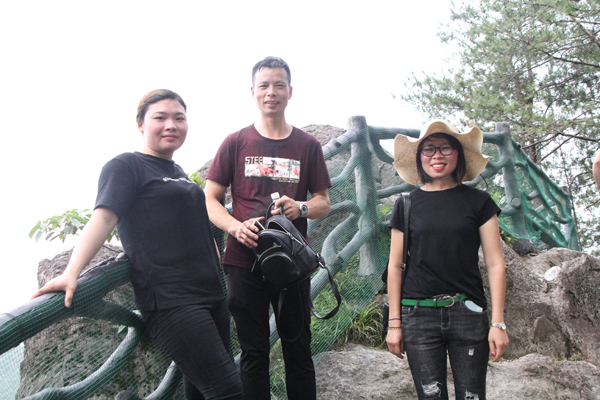 27日早上,大家在簡單進(jìn)餐之后,便踏上了前往仙都景區(qū)的旅游大巴。仙都風(fēng)景區(qū)坐落于縉云縣城東7公里處,自隋代起聞名于世。仙都風(fēng)景區(qū)分布于東西約10公里的練溪兩岸,由鼎湖峰、小赤壁、姑婦巖、倪翁洞、芙蓉峽等游覽區(qū)組成,計(jì)有72奇峰,18處名勝古跡。鼎湖峰景點(diǎn)是整個(gè)風(fēng)景名勝區(qū)的核心,我們自然不會錯(cuò)過。鼎湖峰,又稱“天柱峰”,它東靠步虛山,西臨練溪水,狀如春筍拔地而起,直插云霄,高約160余米,人們嘗謂“天下第一峰”。峰頂有小湖,湖周蒼松翠柏掩映。相傳軒轅黃帝曾置爐于峰頂煉丹,丹成黃帝跨赤龍升天時(shí),丹鼎墜落而積水成湖,故名鼎湖。雨后鼎湖也是別具一格的美景。鼎湖至今無路可攀登,僅有藥農(nóng)架繩索飛渡峰頂采藥。白居易有詩云:“黃帝旌旗去不回,片云孤石獨(dú)崔嵬。有時(shí)風(fēng)激鼎湖浪,散作晴天雨點(diǎn)來”。大家在贊美大自然的神奇之余,都紛紛拿出相機(jī),留下與如此鬼斧神工的景色如此親近的瞬間。下午,又游覽了小赤壁、朱潭山等景點(diǎn)。