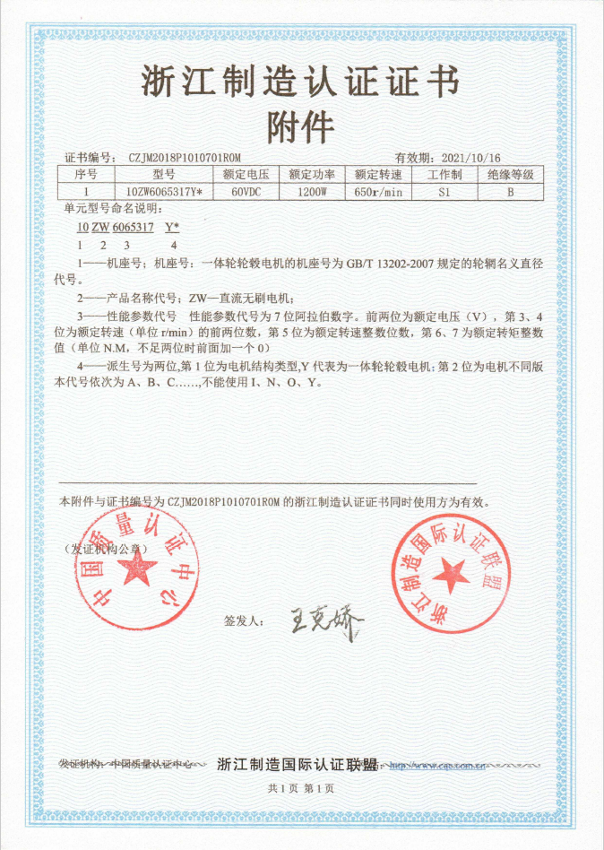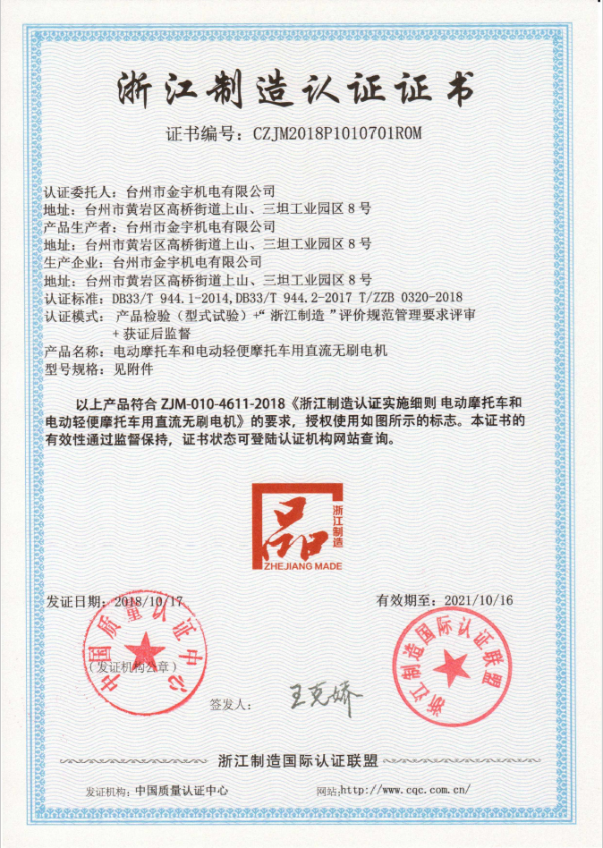 2018年2月9日,《電動(dòng)摩托車(chē)和電動(dòng)輕便摩托車(chē)用直流無(wú)刷電機(jī)》(DB33/T 944.1-2014,DB33/T 944.2-2017 T/ZZB0 320-2018)浙江制造團(tuán)體標(biāo)準(zhǔn)由浙江制造品牌建設(shè)促進(jìn)會(huì)頒布,并于3月1日正式實(shí)施,臺(tái)州市金宇機(jī)電有限公司為該團(tuán)體標(biāo)準(zhǔn)制定的主要起草單位。這是由臺(tái)州市企業(yè)負(fù)責(zé)制定的第一張電動(dòng)車(chē)相關(guān)產(chǎn)品“浙江制造”標(biāo)準(zhǔn),標(biāo)志著我市企業(yè)站上了電動(dòng)車(chē)行業(yè)標(biāo)準(zhǔn)的制高點(diǎn),將有助于完善我市電動(dòng)車(chē)行業(yè)標(biāo)準(zhǔn)體系,進(jìn)一步促進(jìn)臺(tái)州市電動(dòng)車(chē)行業(yè)做大做精做強(qiáng),實(shí)現(xiàn)電動(dòng)車(chē)行業(yè)“標(biāo)準(zhǔn)提高、質(zhì)量提升”的宏偉目標(biāo)。