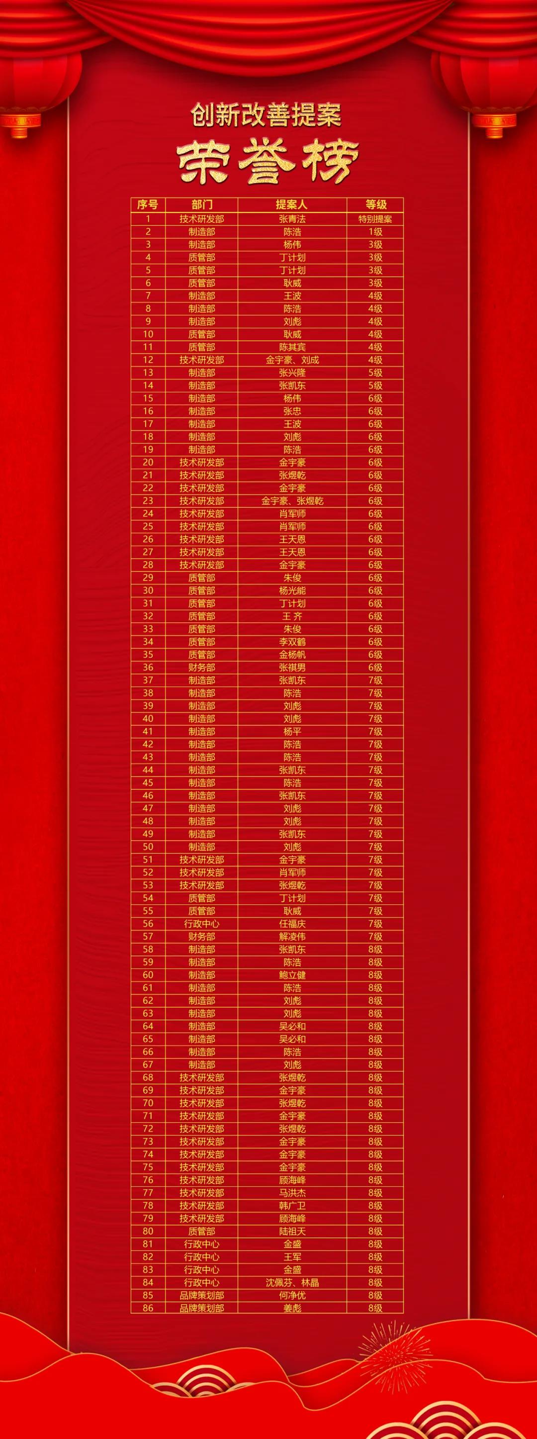 自6月9日,金宇星啟動(dòng)創(chuàng)新改善活動(dòng)以來(lái),已持續(xù)開(kāi)展了兩個(gè)月,成果豐碩。8月6日下午,公司創(chuàng)新改善提案評(píng)審委員會(huì)對(duì)第二、三期創(chuàng)新提案成果進(jìn)行了評(píng)審,對(duì)各提案人依據(jù)獲評(píng)等級(jí)進(jìn)行獎(jiǎng)勵(lì),具體榜單如下: